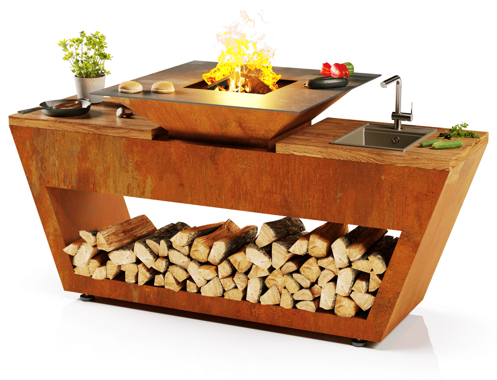 - The wooden countertop and integrated sink allow for convenient outdoor food preparation.